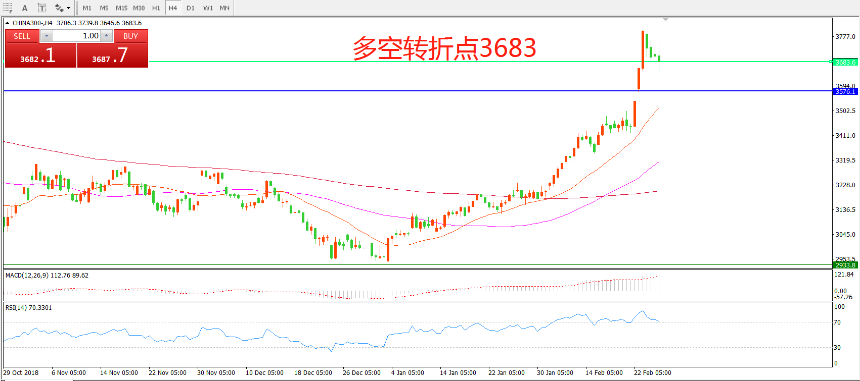 4小时图看,CHINA300中华指数触及上方3800一线出现回落,短期处于调整,但大方向依然向上,均线系统呈多头排列, MACD红柱增加,整体思路逢低做多