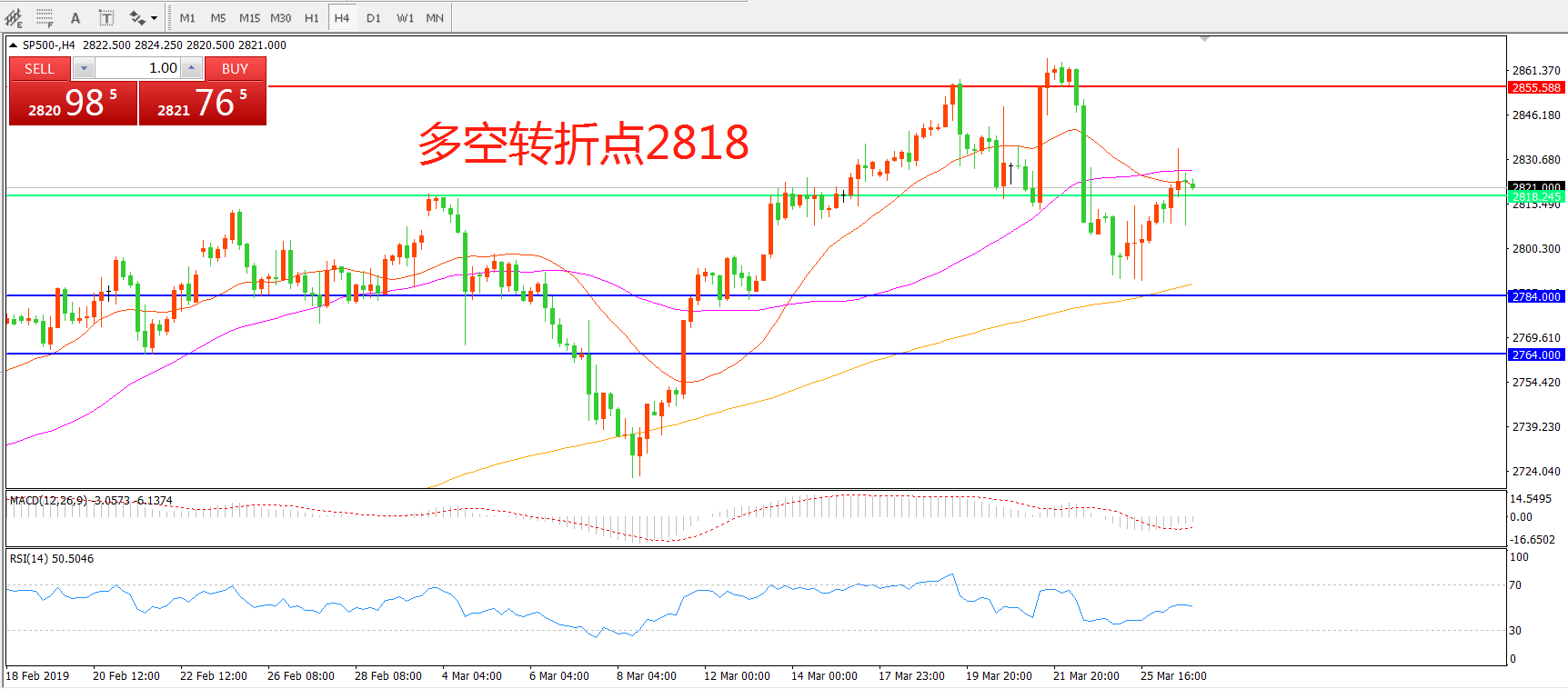 4小时图看,标普500回踩200周期均线附近连续反弹, 目前收于2818支撑之上,短期均线走平,MACD绿柱减少,日内延续震荡概率较大。