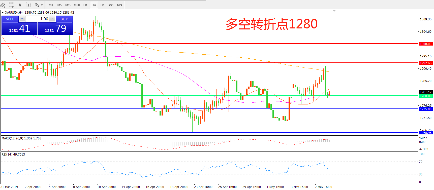 美国总统特朗普周日在推文中表示征收新的关税,这导致全球贸易紧张局势在本周迅速升温。周三晚间,商务部新闻发言人就美方拟升级关税措施发表了谈话。谈话指出,美方拟于5月10日将2000亿美元中国输美商品的关税从10%上调至25%。如果美方关税措施付诸实施,中方将不得不采取必要反制措施。周四和周五两天的贸易谈判至关重要。日内金价最高曾冲到1291美元,不过进入到美盘时段之后,金价自日高回落近8美元,收回了大部分日内涨幅,但依然位于1280之上。