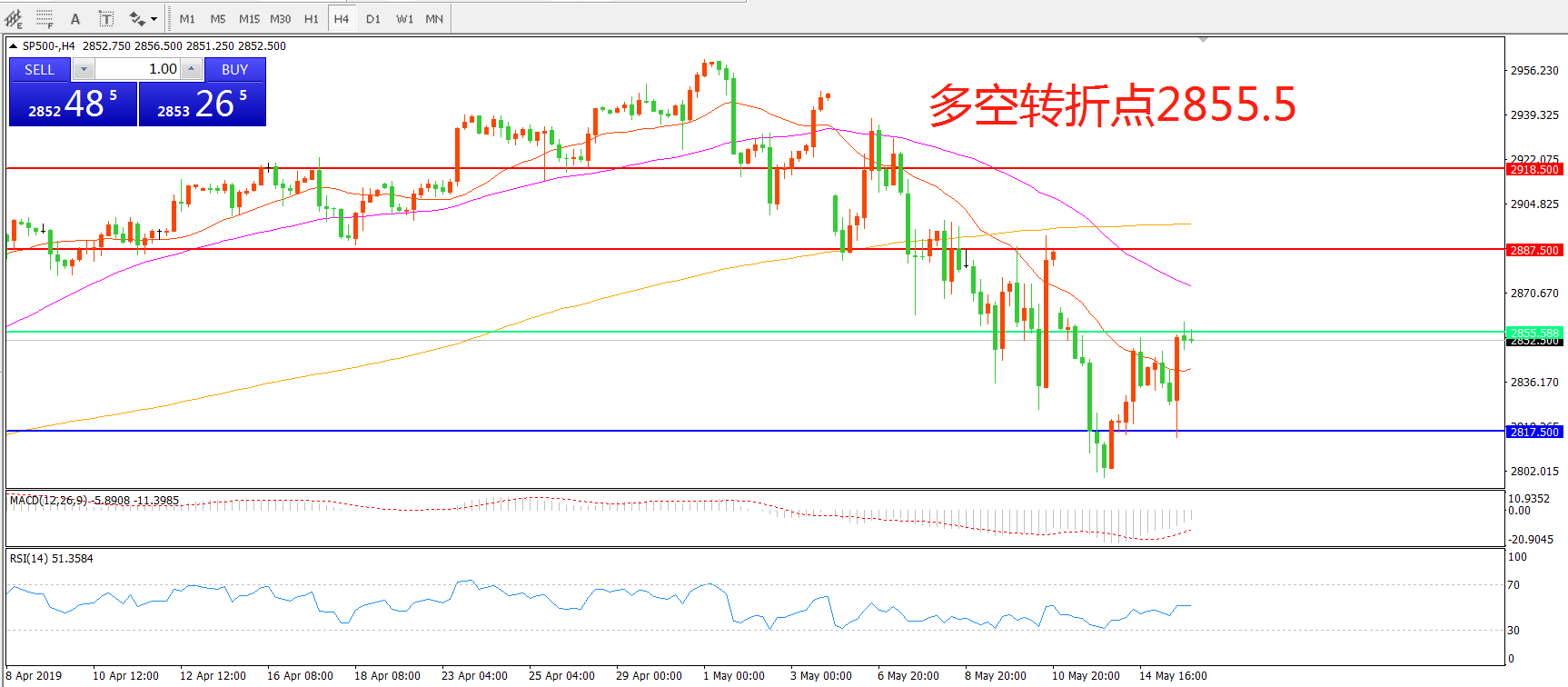 4小时图看,标普500长阴下挫后震荡企稳,昨日长阳反弹后触碰2855.5附近回落,短期均线呈空头排列,但 MACD绿柱缩短,RSI指标拐头走平,日内重点关注2855.5一线得失。