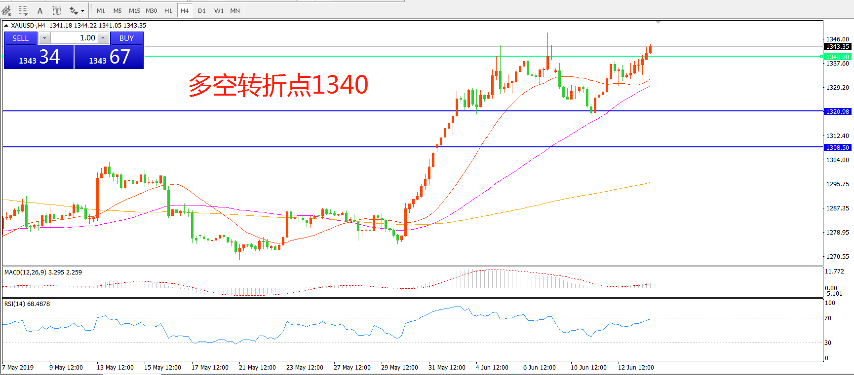 4小时图看,金价连续上涨,突破前期阻力1340,均线系统呈多头排列, MACD红柱增加,RSI指标向上,日内延续上行概率较大。