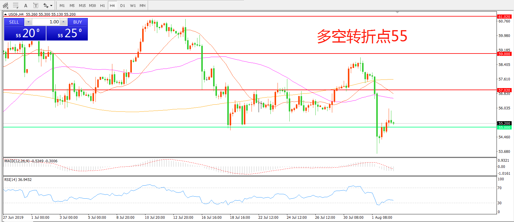 受美国总统特朗普威胁要对更多中国进口商品征收关税影响,油价在上周四(8月1日)创下多年来的最大单日跌幅,特朗普引发的贸易紧张局势依然令市场承压,但OPEC原油产量继续下滑以及美国石油钻井数连降五周为油价带来利好,美国WTI原油周五(8月2日)小幅反弹,收报55.20美元/桶。