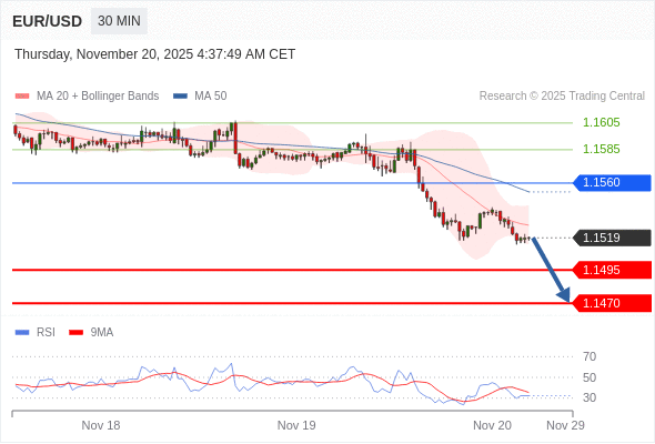 在 1.1560 之下,看跌,目标价位为 1.1495 ,然后为 1.1470 。