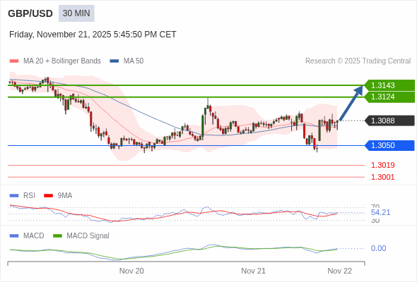 英镑/美元 当日内 : 看涨,当 1.3050 为支撑位。