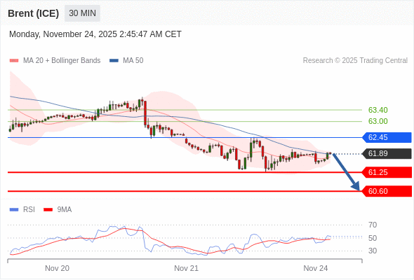 交易策略: 在 62.45 之下,看跌,目标价位为 61.25 ,然后为 60.60 。