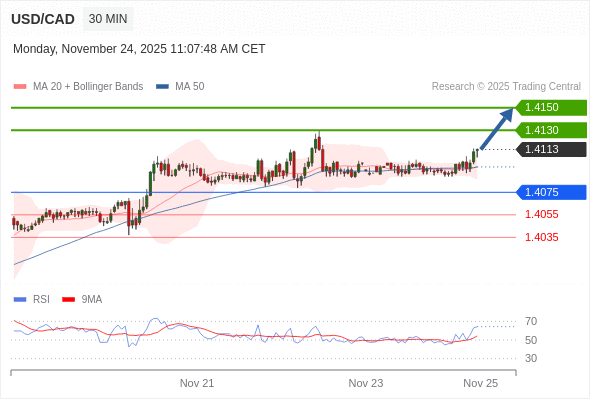在 1.4075 之上,看涨,目标价位为 1.4130 ,然后为 1.4150 。