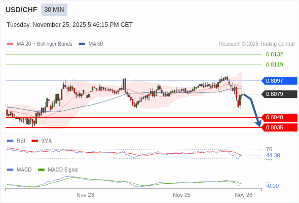 美元/瑞郎 当日内 : 看跌,在 0.8097 之下。