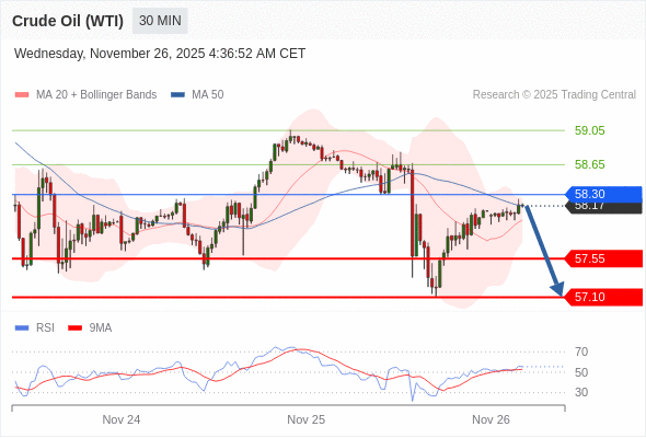 在 58.30 之下,看跌,目标价位为 57.55 ,然后为 57.10 。