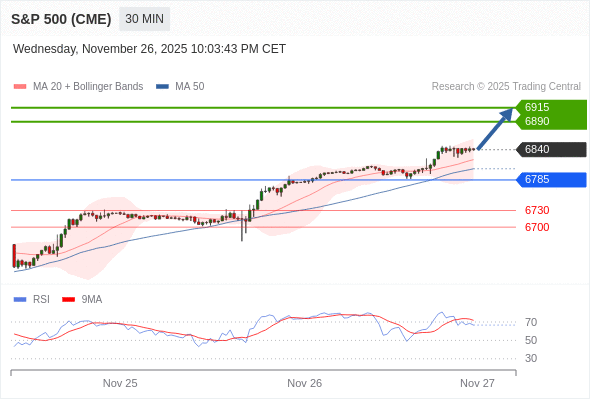 在 6785 之上,看涨,目标价位为 6890 ,然后为 6915 。