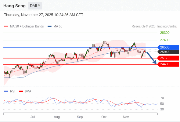 在 26500 之下,看跌,目标价位为 25170 ,然后为 24400 。