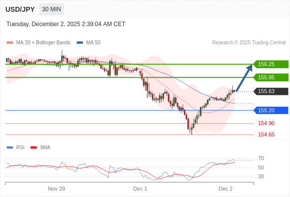 在 155.20 之上,看涨,目标价位为 155.95 ,然后为 156.25 。