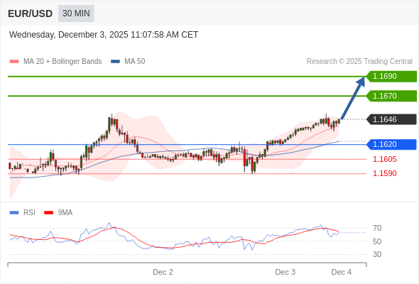 在 1.1620 之上,看涨,目标价位为 1.1670 ,然后为 1.1690 。