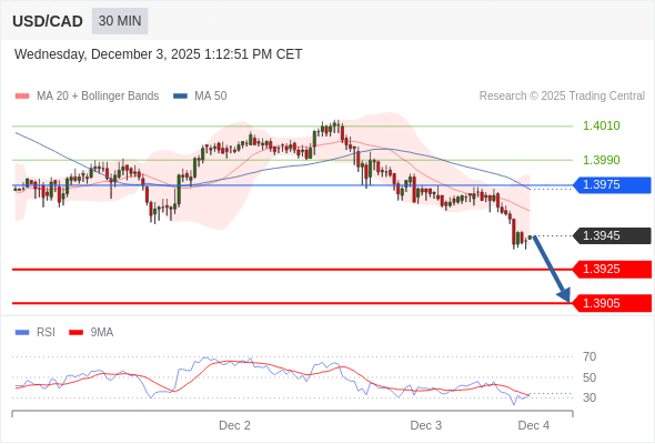 在 1.3975 之下,看跌,目标价位为 1.3925 ,然后为 1.3905 。