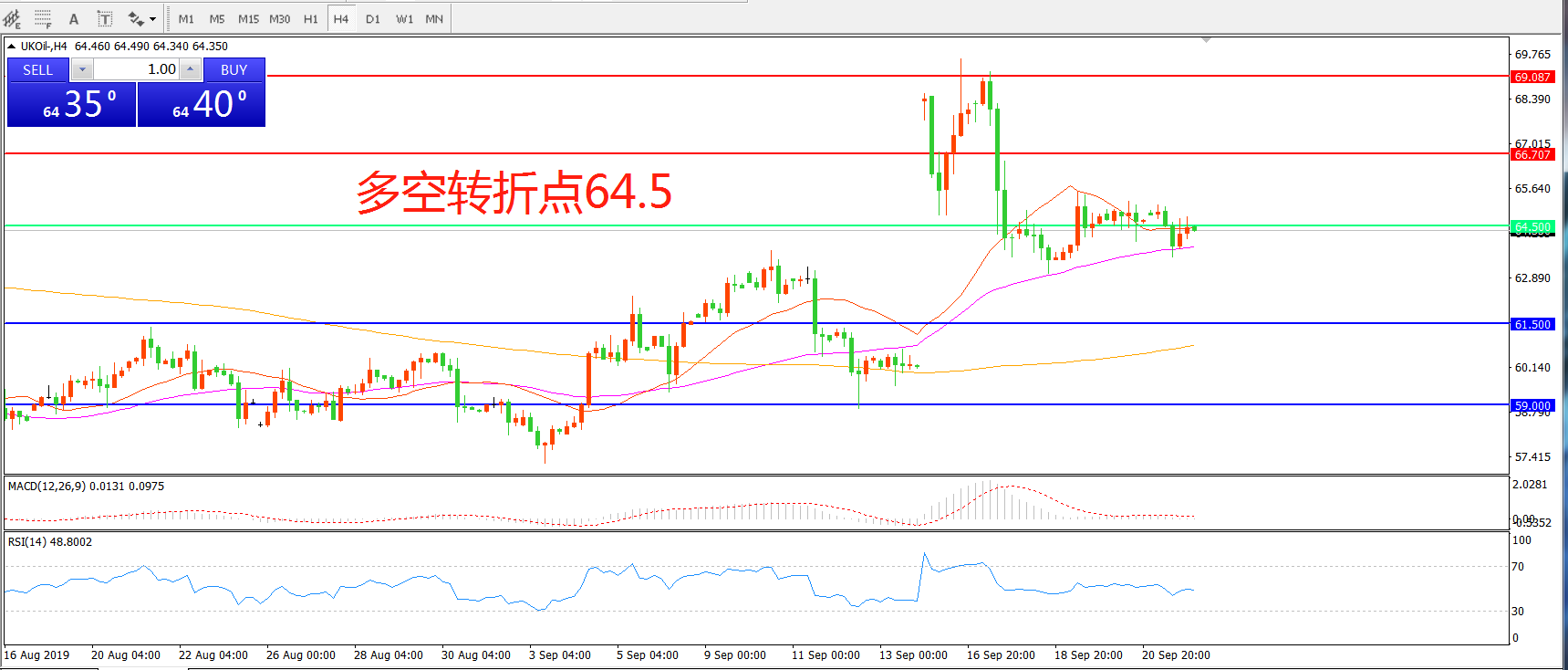 周一(9月23日)油价继上周大涨近7%后,呈现宽幅震荡状态,布伦特原油日内冲高回落,最终收报64.35美元/桶,9月14日沙特石油设施遭到袭击后,人们对全球供应的担忧挥之不去,抵消了沙特石油产量恢复速度快于预期以及欧洲经济疲软迹象的影响,多空交织之下,油价需要一定时间进行调整。
