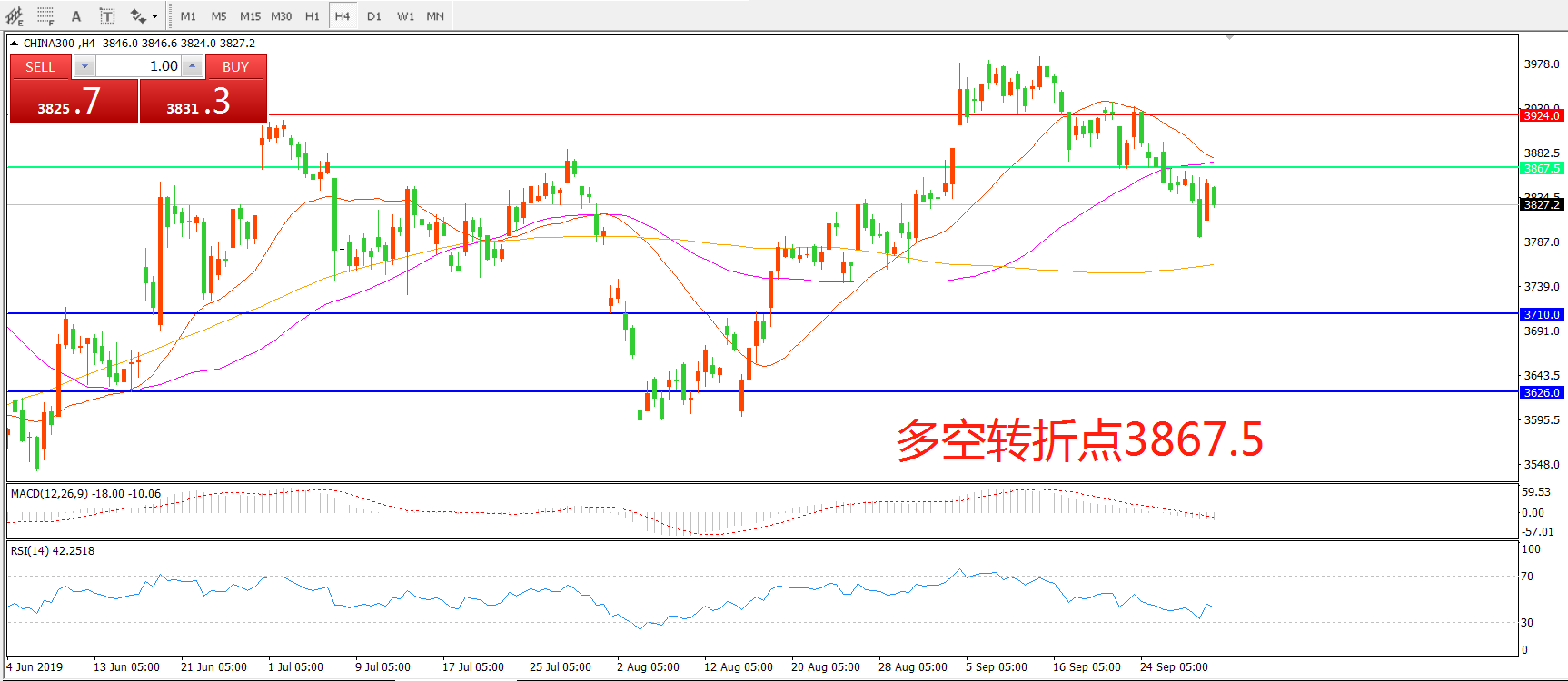 4小时图看,沪深300延续震荡,3867.5被跌破后,整体走势偏弱,21周期均线有下穿形成死叉迹象,MACD红柱减少,RSI指标向下,日内依然有回落风险。