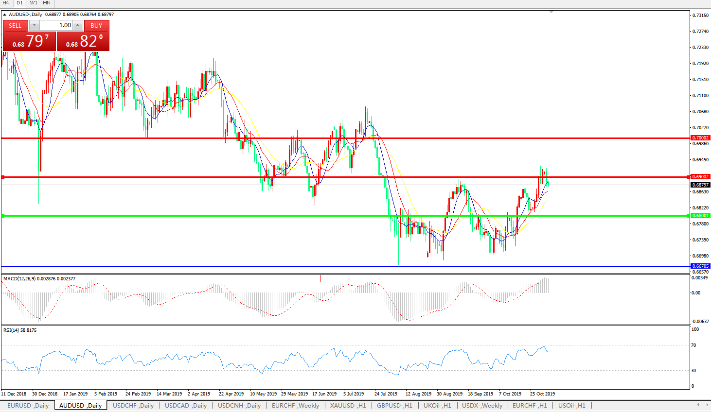 澳元兑美元高位震荡,市场静待周二澳洲联储更多指引; 澳元兑美元周一在0.69上方的区间高位震荡,上周以来美元指数的持续颓势,以及国际贸易领域的乐观情绪,都对澳元汇价起到了支撑作用。然而,周二澳洲联储政策决议在即这一事件,却令多头暂缓了追高澳元的步伐;虽然,市场并不太多预计澳洲联储在周二的会议上再度降息,但是在美联储上周利率“三联降”之后,澳洲联储面对之后的政策预期给出指引却是必须的功课。这之中蕴藏的不确定性令投资者暂时采取了观望姿态;同时,澳元在继续上行途中,还面临着趋势阻力的打压。目前,在0.6954处的200日均线依旧看似不可憾动,自2018年3月以来,澳元兑美元日线收盘始终未能站上过200日均线。欲突破这一阻力需要更强大的利多消息推动,绝非澳洲联储在周二暂缓降息即可。而一旦升破,也就意味着中期反转走势的正式开始。