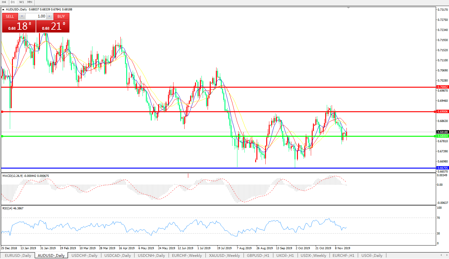 澳元兑美元在周二早盘因澳洲联储会议纪要措辞再度偏好鸽派,强调经济风险而跳跌,此后汇价因美元指数的疲软而略有反弹,但总体表现依旧低迷,很大原因在于市场对全球贸易局势前景能否如预期好转正生出了更多疑虑; 而作为一个出口导向式的经济体,澳洲经济对于来自贸易领域的影响尤为敏感。在此前该国10月就业状况意外逊色之后,澳洲联储12月降息的预期也重新萌生,日内的澳洲联储纪要也更加凸显了这一预期。这令澳元汇价延续了近期以来偏向下行的趋势;眼下,澳元兑美元短线支撑仍是上周创下的0.6770这一近一个月低点,跌破之后将打开更深的下行空间。而上方,当前10日、30日和100日均线已在0.6838处形成三重交叉,这将成为汇价反弹过程中的强阻力位,升破此点位方可宣告短线下行趋势的暂告一段落。