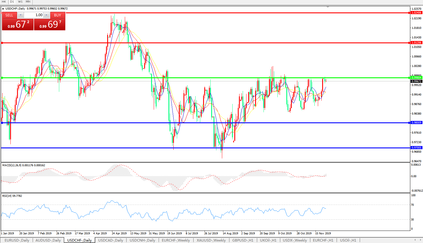 美元兑瑞郎在周一延续高位盘整行情,亚洲时段小幅回吐上周五涨幅,跌至日低0.9965,但在欧洲时段重新走强,触及0.9985这一10月16日以来的五周半新高。主要是受到了全球风险情绪重新转暖和美元走强的带动; 上周五美国经济数据整体向好的走势带动美元指数重上98关口,周一日内美指继续在高温盘整,与此同时,周末国际贸易方式再度传出利好消息,也推动了全球风险情绪转暖,对于瑞郎这样的避险货币而言是额外的打压,令 其与现货黄金和日元等避险资产联手走低; 在此状况下,美元兑瑞郎汇价重新逼近平价关口,但在贸易局势尚欠“临门一脚”的背景下,上破1.00关口的动能仍旧受限,市场本周仍将关注贸易领域的进一步动向。同时,本周后半段美国迎来感恩节假期,汇市交投清淡期间波动幅度可能扩大,须对此格外留意。