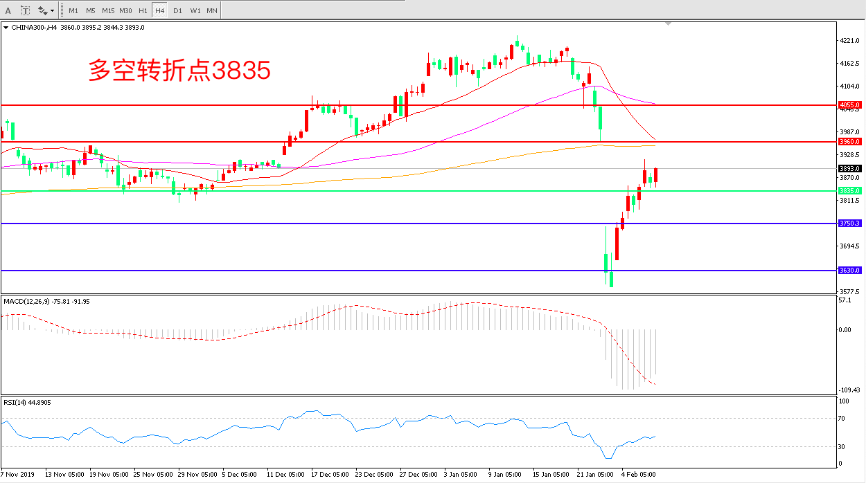 4小时图看,沪深300阳线连续拉升,整体表现强势,3835一线成为支撑,均线系统走平,MACD绿柱缩短,RSI指标走平,日内延续上行概率较大。