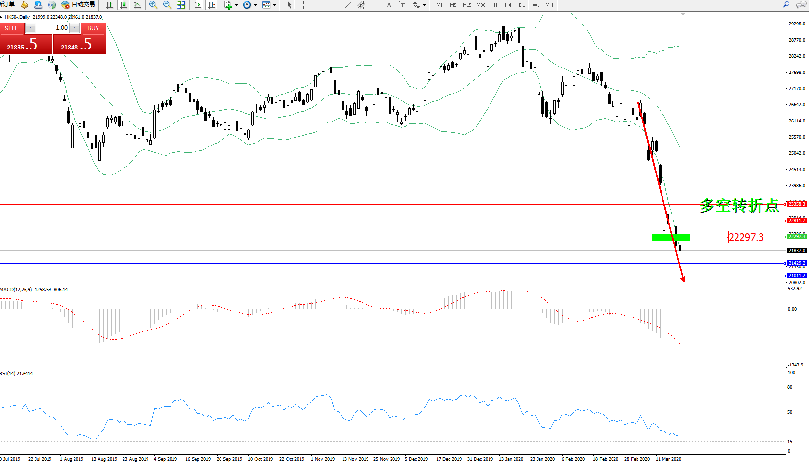 香港恒生指数319日(周四)收盘下跌582.69点,跌幅2.61%,报21709.13点;港股市场整体现大跌行情,主要股指大幅探底后跌幅开始收窄。上午盘开盘后现单边下跌行情,恒指一度大跌超5%下挫超千点。随着市场情绪转好,午后震荡回升。但外围疫情仍旧持续恶化,时刻影响市场走向。主板成交量为1910.53亿港元,港股通大幅净流入167.1亿港元。股、债券、商品甚至黄金都在抛售加剧,说明流动性危机——金融危机的前兆已经出现,要做好应对金融危机的准备,疫情全球大流行只是导火索,根源是全球经济、金融、社会的脆弱性。