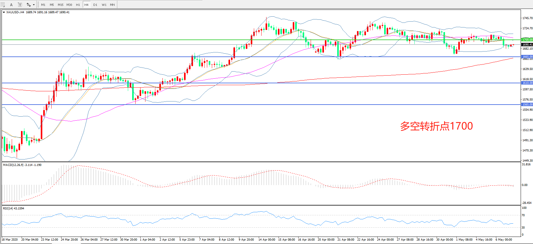 周二(5月5日)有“小非农”之称的ADP就业人数骤减2023.6万人,创下有史以来的最糟糕表现。但由于市场已经对疲弱的就业数据充分预期,数据公布后,现货金价短线基本持稳,后因美元走强小幅下跌,收报1689.61美元/盎司。周五将公布非农就业人口数据,务必重点关注。