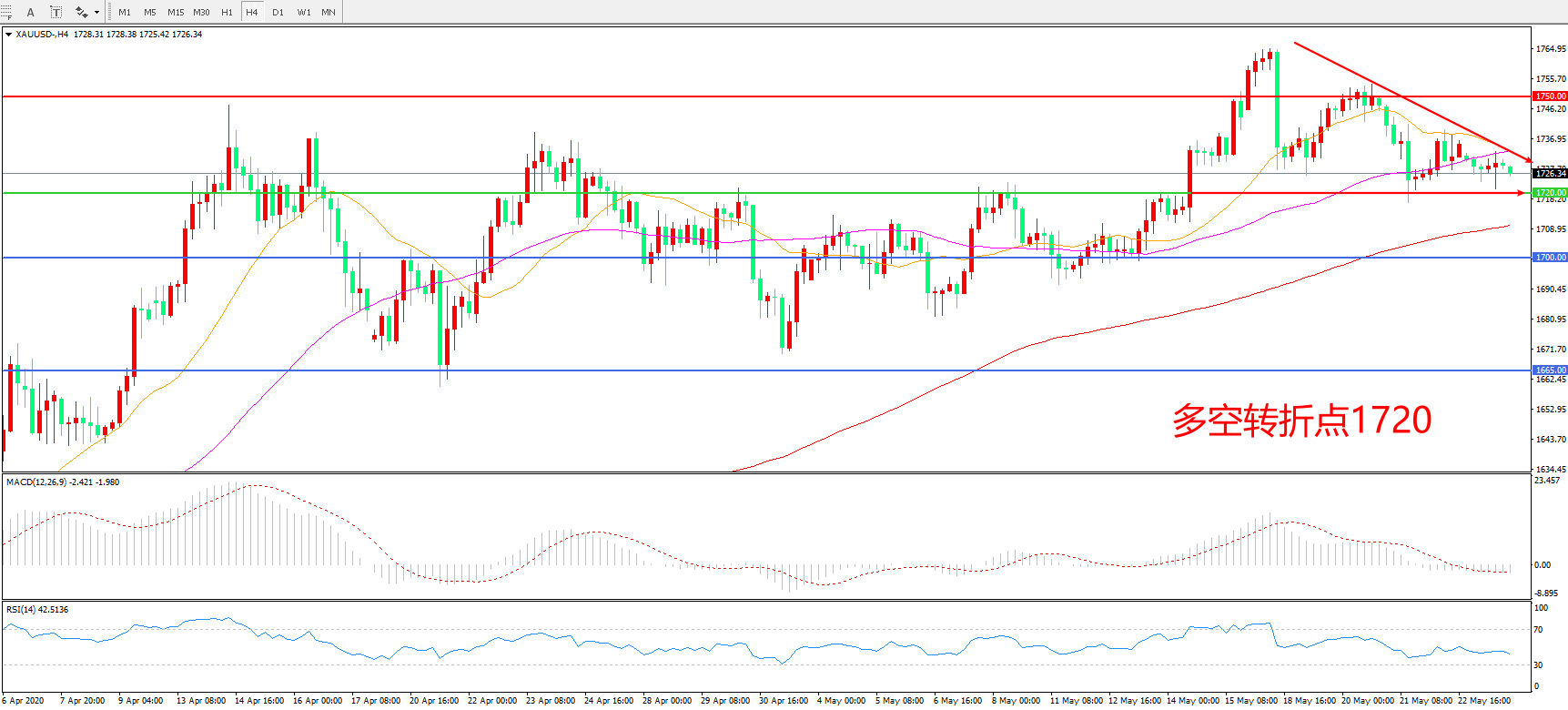 4小时图看,金价延续震荡,整体波幅逐渐偏窄,1720成为下方支撑,高点逐渐降低,MACD红柱增加,RSI指标走平,日内延续震荡概率较大。