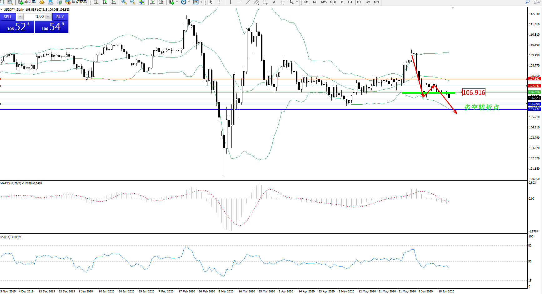 美元兑日元下跌0.36%至106.52,一度触及六周低点106.07;汇率触发了在106.45/50下方的止损;关键支撑位在5月6日低点105.99;一位纽约交易员表示,期货市场上大约6亿美元的交易在一分钟之内成交;美元指数继续回落,且二次疫情风险不减,美元指数跌至一周新低,而市场风险偏好情绪也起伏不定,整个市场还是受到避险需求的影响,而后市各国央行还可能会进一步刺激,以应对疫情,这对日圆是一大支撑,近期美国疫情有升温之势,外加巴西等国的疫情发展,令市场非常担忧。除了二次疫情愈演愈烈,日元并无太明显的避险需求,此外全球股票市场依旧备受青睐,这使得日元近期并无明显趋势性上涨行情。