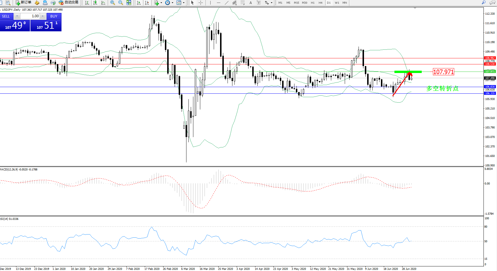 美元兑日元当前仍然处于盘整行情之众,眼下市场多空消息相抵,美国独立日假期,美国纽约证券交易日周五(7月3日)休市一天。因此外汇市场波动整体有限,市场交投情绪谨慎,但此后若全球尤其是美国本土疫情传来乐观前景,那么美元兑日元将有再度上行的潜能,而反之,若消息面继续恶化,则避险日元将再度得到市场热捧,不过,由于日本央行此前丑话在先,一旦日元走势过强将引发干预力量入市,因此除非出现黑天鹅式意外事件,否则中短期内美元兑日元料也很难跌破106这一箱体下轨支撑。