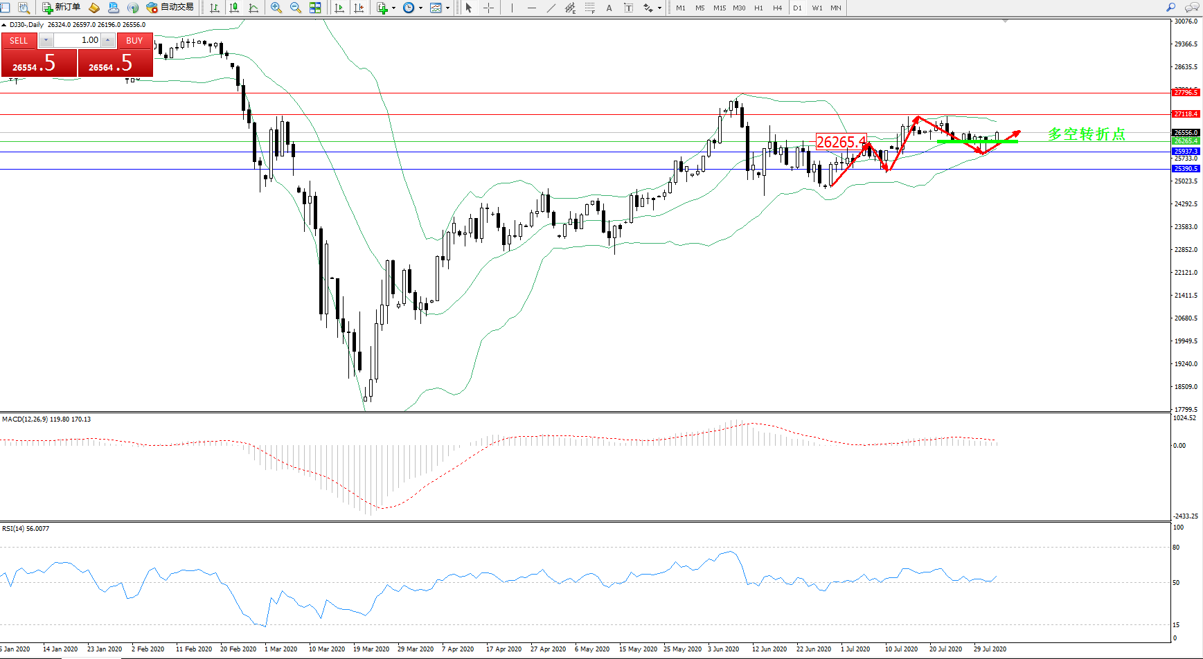 道琼斯指数8月3日(周一)收盘上涨236.10点,涨幅0.89%,报26664.40点。投资者等待就美国国会就新一轮援助计划议案达成协议的迹象,议员们正在努力敲定这项议案。美国公布市场密切关注的7月ISM制造业PMI数据,结果该数据表现略超预期。尽管7月美国制造业活动的趋稳令人欣喜,但是增长乏力却也让人失望。此外,新业务的亏损加速也让市场担忧需求依然疲弱。很多公司受全美多地再次封锁的拖累明显。公司的成本却在螺旋式增加。预计疫情对美国经济影响最大的阶段大概率已经过去,虽然三四季度经济增长仍将处于衰退,但将逐季环比改善。如果年内疫苗推广上市,明年一季度经济有望在低基数效应下由负转正,二季度增速将大幅提高,全年实现正增长。