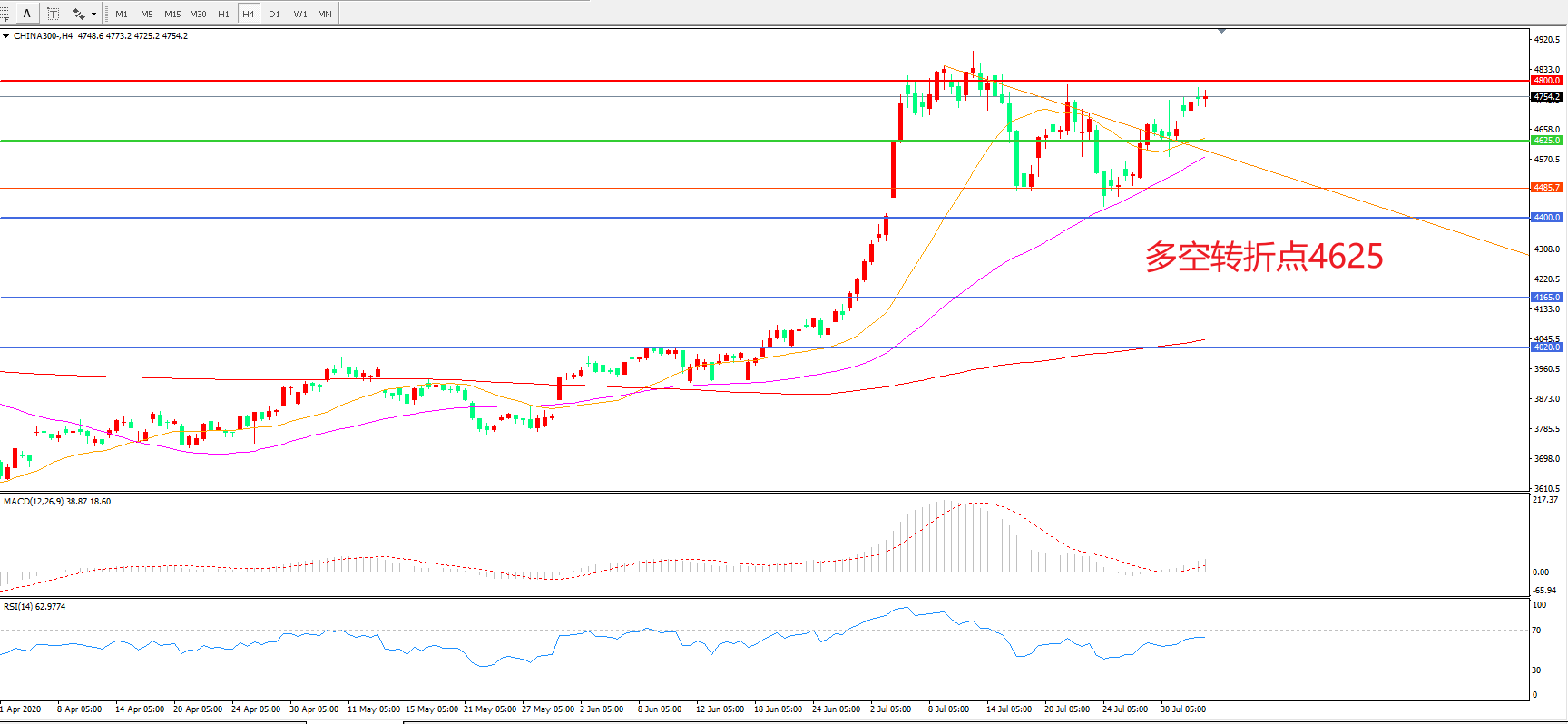4小时图看,沪深300延续高位震荡,十字星收盘表明多空博弈胶着,三角形整理突破后,短期走势偏强,4800成为上方阻力,均线系统拐头向上, MACD红柱缩短,RSI指标走平,日内延续震荡概率较大。