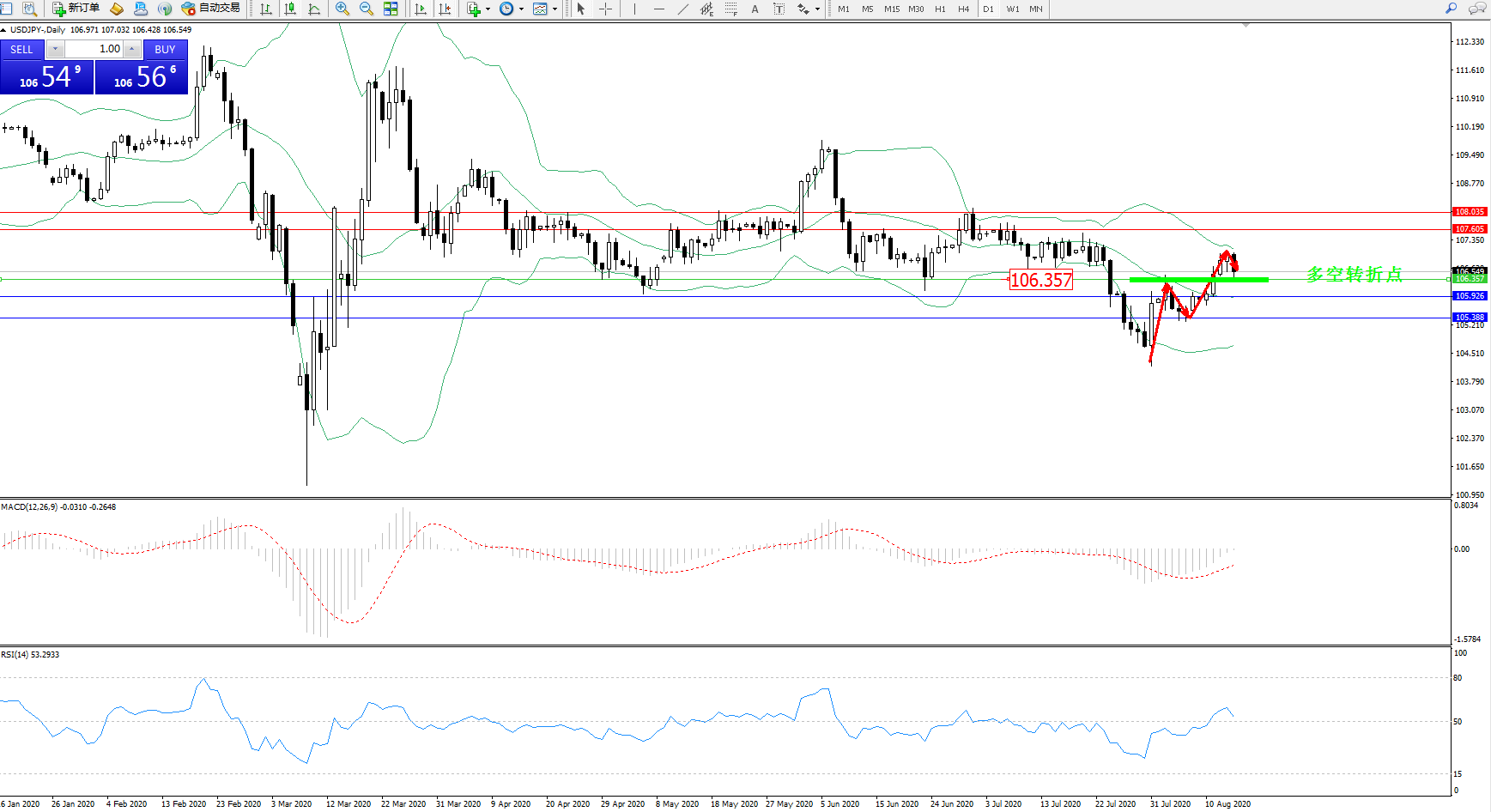 交易策略:106.357上方看涨,目标107.605、108.035