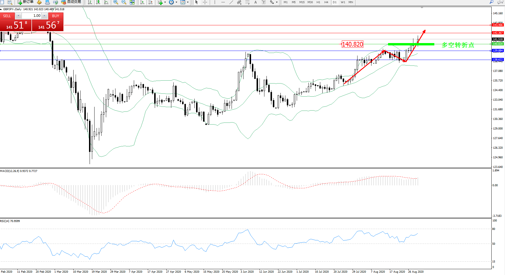 交易策略:140.820上方看涨,目标142.367、143.466