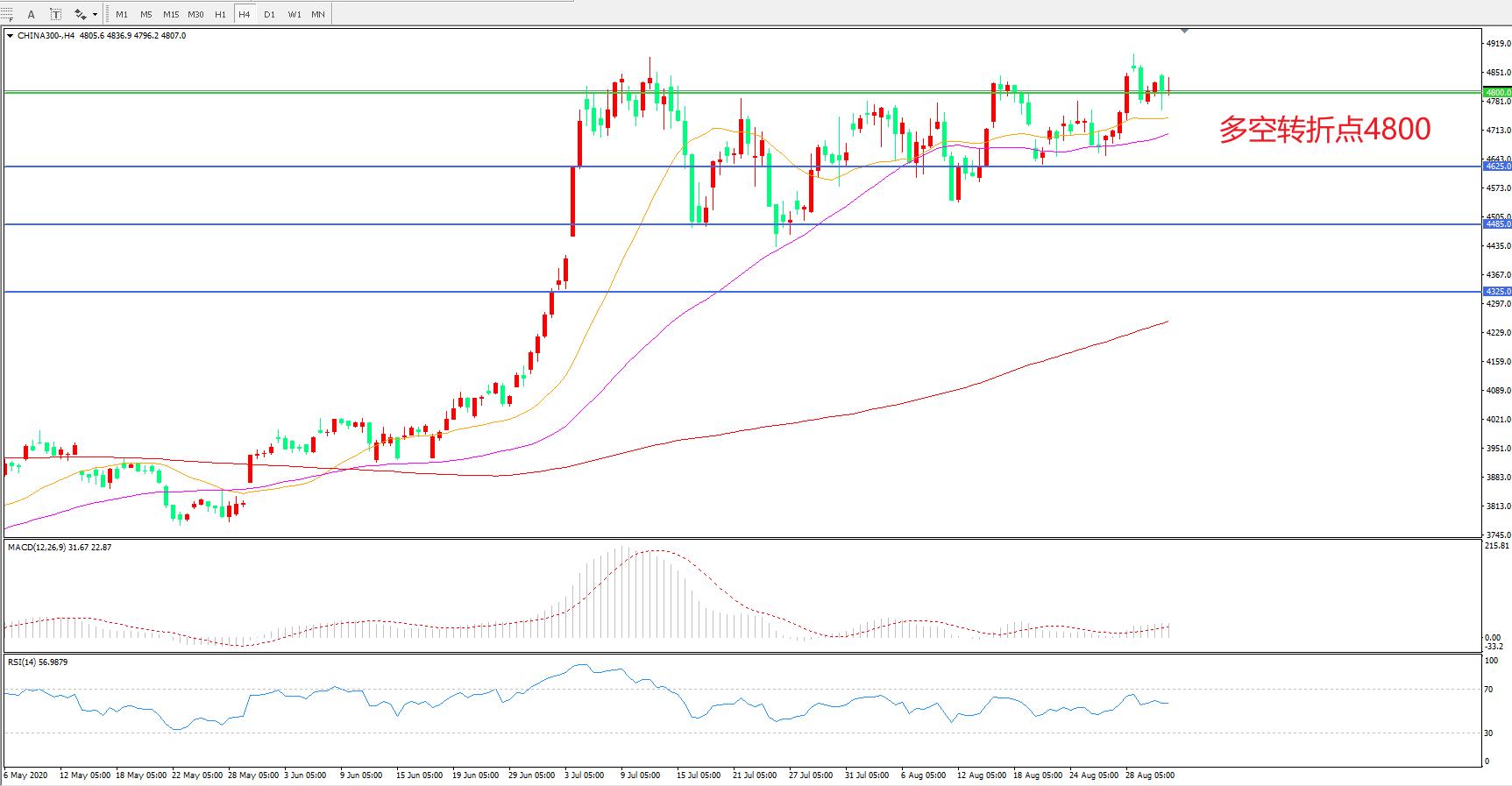 4小时图看,沪深300冲高回落,高位震荡迹象明显,4800成为多空争夺焦点,均线系统走平, MACD红柱增加,RSI指标向上,日内延续上行概率较大。