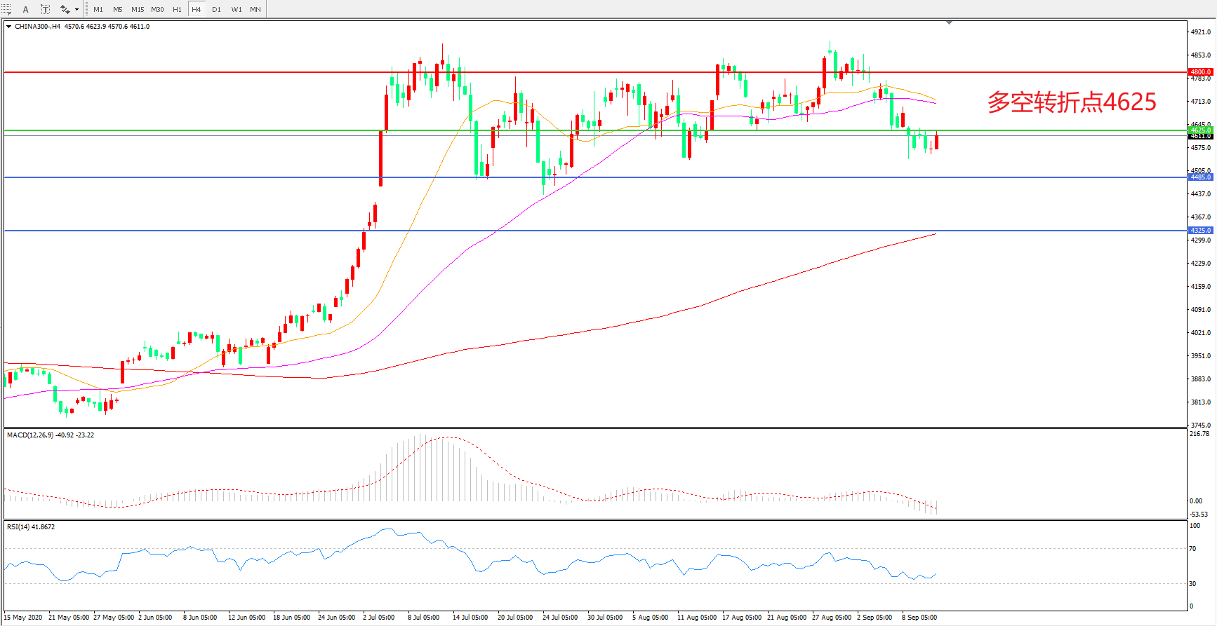 4小时图看,沪深300延续低位震荡,短期走势低迷,4625成为短期多空分水岭,均线系统走平, MACD绿柱增加,RSI指标向下,日内延续震荡概率较大。