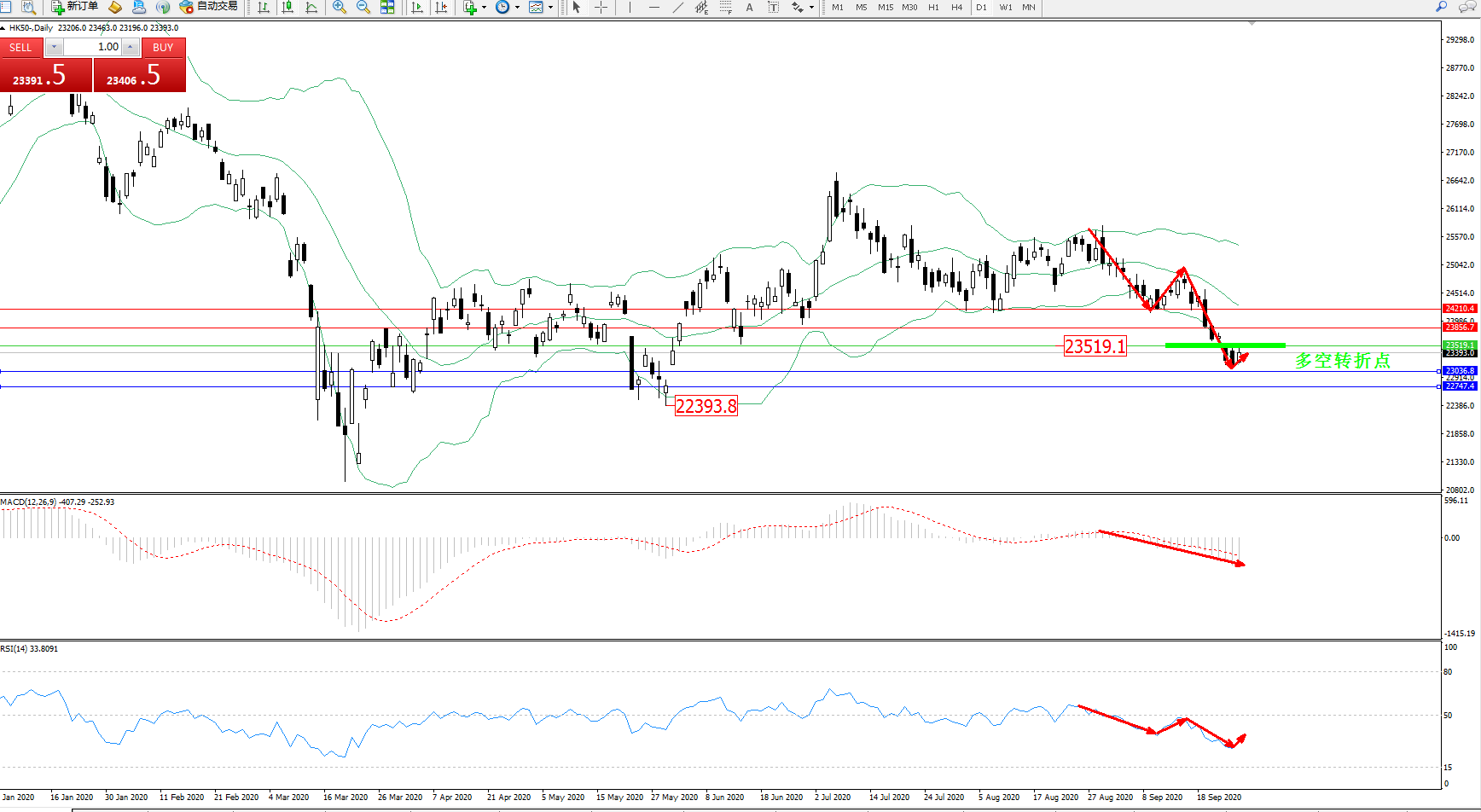 技术点评:空头动力处于布林带指标通道下轨持续震荡不断下移中,空头动力下破下轨后有继续下行态势,跌势未有止步迹象,前期低位22393位置近在咫尺,破位在即,布林带指标呈缓慢张口走势持续向下移动中,MACD指标处于0轴线下方空头区域维持弱势窄幅整理平缓慢向下移动中,RSI指标处于50均衡线下方空头区域维持弱势震荡中;