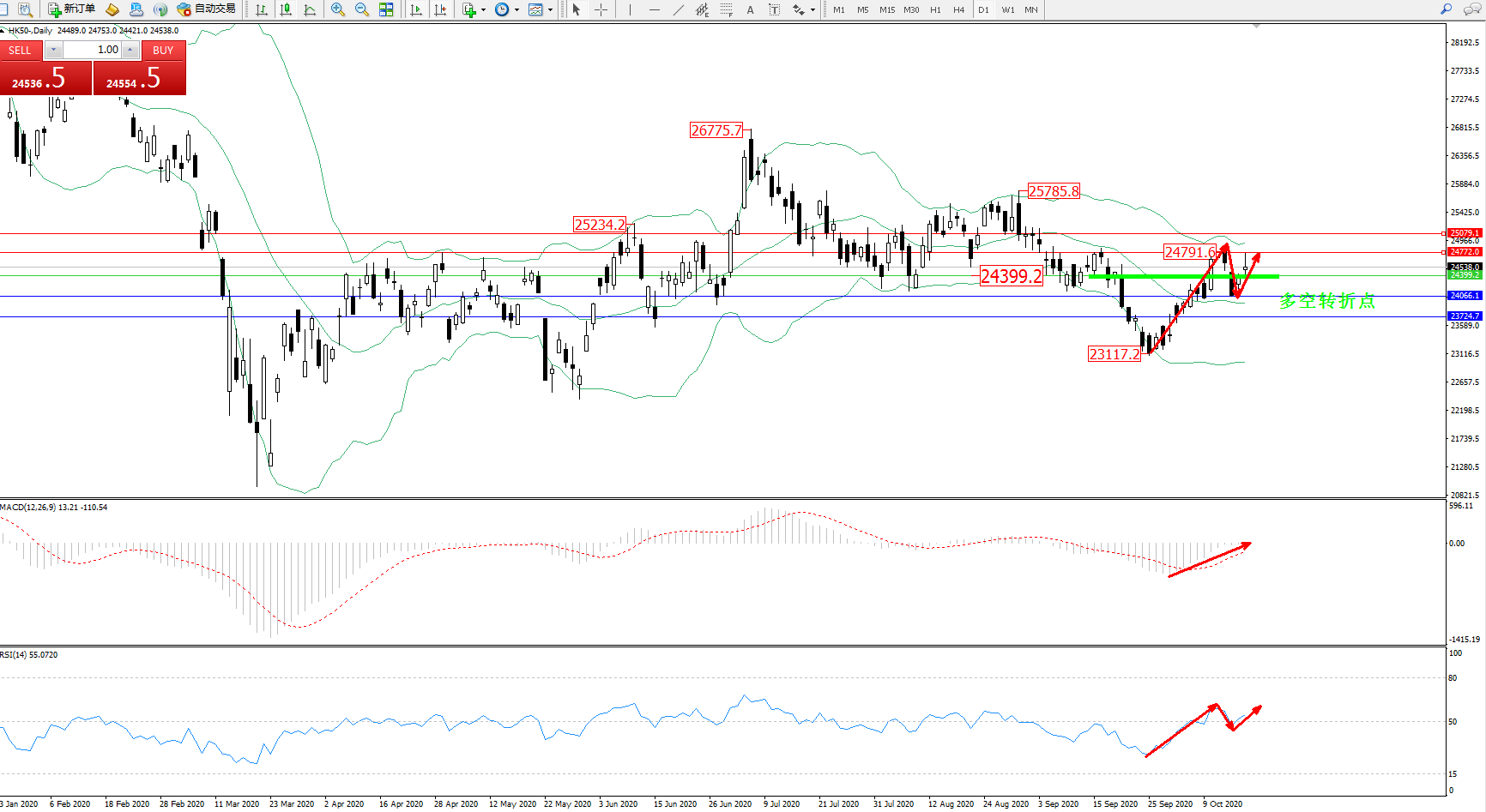 香港恒生指数10月19日(周一)收盘上涨155.47点,涨幅0.64%,报24542.26点;港股恒指全日高位震荡,午后升幅收窄,恒生科技指数跌0.45%。内银股、内险股全天强势,支撑大市向好;大型科技股走势分化,小米跌4.1%,美团跌2.56%,京东、阿里、腾讯小幅收涨;今日南下资金净流入24.18亿港元,大市成交额为1228亿港元。恒生指数的PB又回到了2015/2016年的1x左右,而PE约12x,均在历史相对低位。加上AH股的溢价指数达到历史高位的146以及在美元结构性向下的趋势中,港股的长线配置价值显现。四季度A股和港股会是震荡向上的走势,周期股可能面临阶段性的补涨行情。中途的调整是非常好的加仓机会,看好港股的新经济、消费等板块。