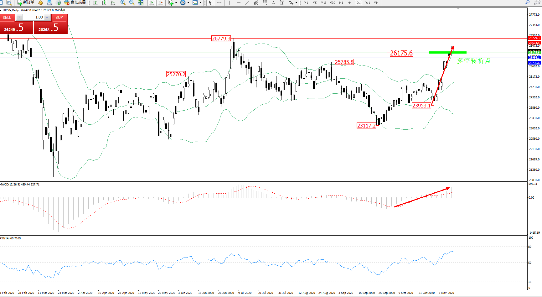 香港恒生指数11月11日(周三)收盘下跌74.50点,跌幅0.28%,报26226.98点;港股主要指数均收跌,恒指尾盘由涨转跌,技股再度大跌,致恒生科技指数大幅收跌6.23%,两日累跌超11%。市场热点切换较快,此前强势的科技股今日再度重挫,阿里、美团、京东均大跌超9%,腾讯跌超7%;体育用品股与港口海运股亦全线回调,李宁大跌近11%,日前曾创新高;重型基建股、建材水泥、燃气股、煤炭股等周期板块崛起,香港本地股持续活跃;国际油价上涨,石油股走强撑市。今日南下资金净流入99.94亿港元,大市成交额放大至2674.5亿港元。港交所行政总裁李小加今日在2020年第三季度业绩会上称,目前香港IPO市场势头依旧强劲,最近两周将有7家新股在港交所挂牌。对于市场备受关注的阿里巴巴加入港股通进展,他个人对此保持乐观的心态,因为在他看来,阿里巴巴进入港股通是迟早的,只是时间问题,而不是能否可以进的问题。李小加也表示,希望尽早看到阿里巴巴可以进入港股通。