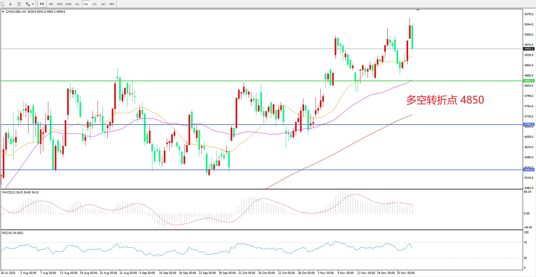 4小时图看,沪深300冲高回落,长阴回调之后短期涨势暂缓,21周期均线成为短期支撑,5000成为上方阻力,MACD红柱增加,RSI指标向上,日内延续震荡概率较大。