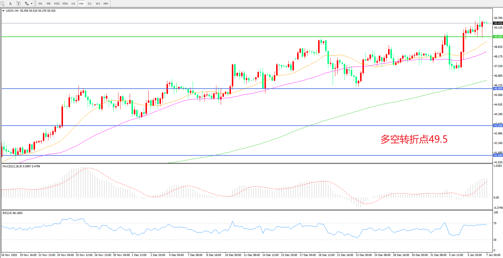周三(1月6日),民主党“一统两院”几成定局,市场期待未来推出更多刺激政策,油价一度出现大涨,但特朗普支持者“攻陷”国会,拜登当选认证程序被推迟,美国WTI原油震荡回落,最终收报50.43美元/桶。但国会最终还是会确认拜登当选美国总统,所以不会对市场产生太大影响。