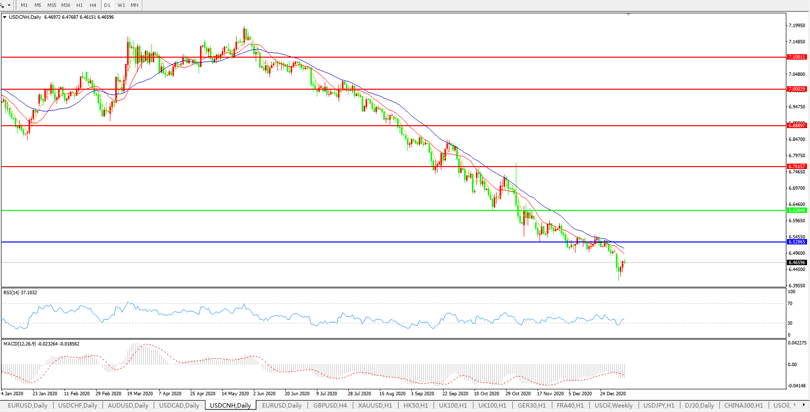 美元兑人民币USDCNH 日线图: