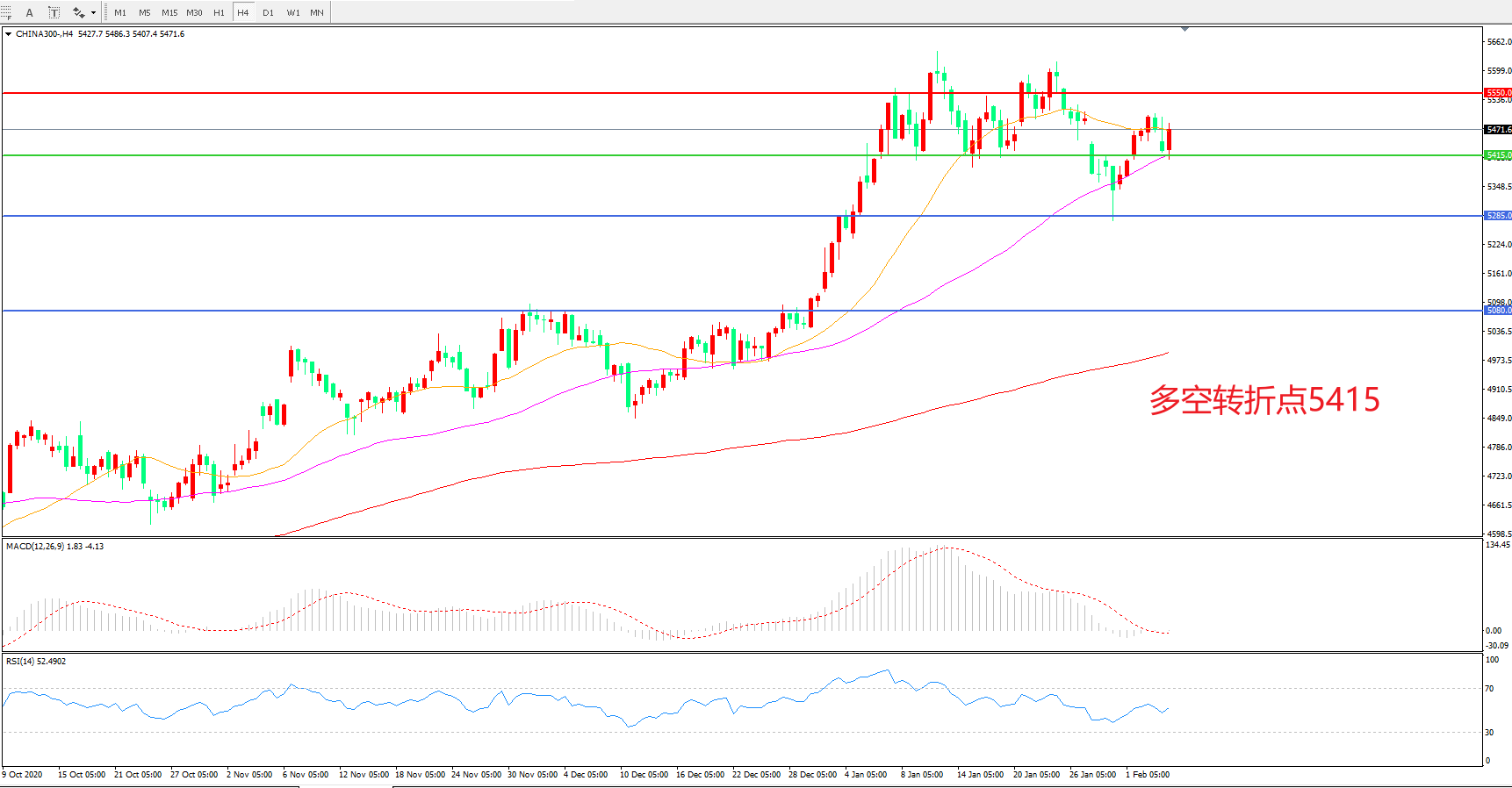 4小时图看,沪深300回踩55周期均线后震荡反弹,短期走势有所回暖,5415成为下方支撑,MACD红柱缩短,RSI指标走平,日内延续震荡概率较大。