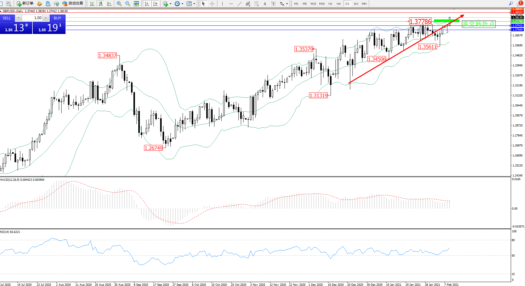 交易策略:1.37786上方看涨,目标1.38553、1.38844