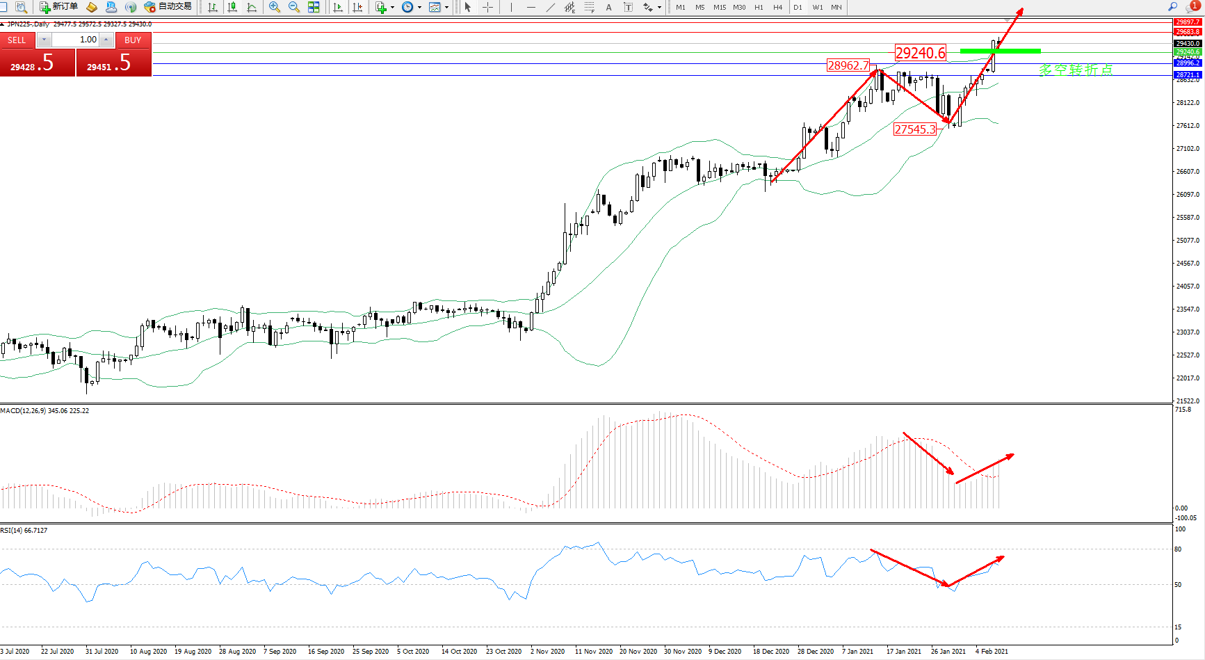 日经225指数2月9日(周二)收盘上涨127.00点,涨幅0.43%,报29515.50点。日本第四季度GDP数据将于下周公布,去年第三季从战后最大的衰退强劲反弹后,第四季经济增长可能收缩,显示家庭与企业尚未从新冠疫情打击中复苏。经济增长停滞甚至收缩的前景为日元中长期带来转跌风险,美元兑日元多头等待GDP数据带来转机。预计10-12月当季日本经济较前季扩张2.3%,因出口好转抵销了一些消费疲态。不过,这与第三季环比跳增5.3%相比要放慢许多,前一次紧急状态在当时解除后帮助经济摆脱了4-6月季度创下的战后最严重下滑。旺盛的海外需求支撑出口,与此同时,内需也得到政府刺激措施的些许提振,但前景仍不明确。