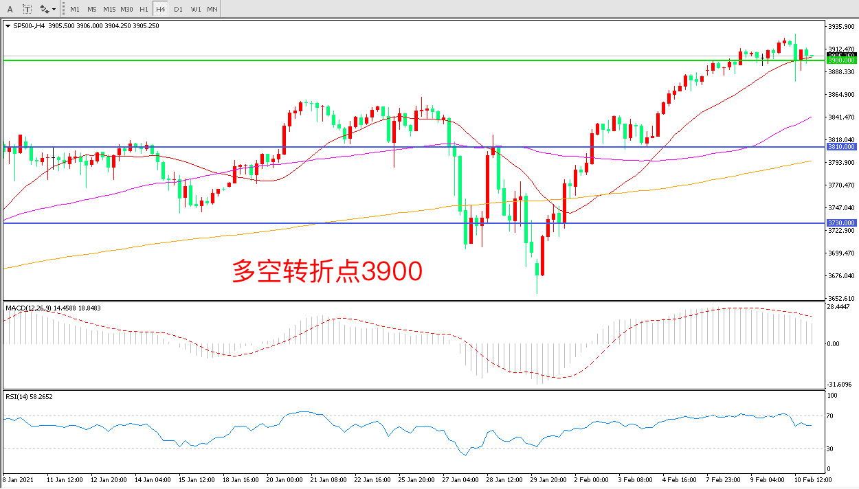 4小时图看,标普500延续高位震荡,整体波幅不大,3900成为下方明显支撑,均线系统呈多头排列,MACD红柱缩短,RSI指标走平,日内延续震荡概率较大。