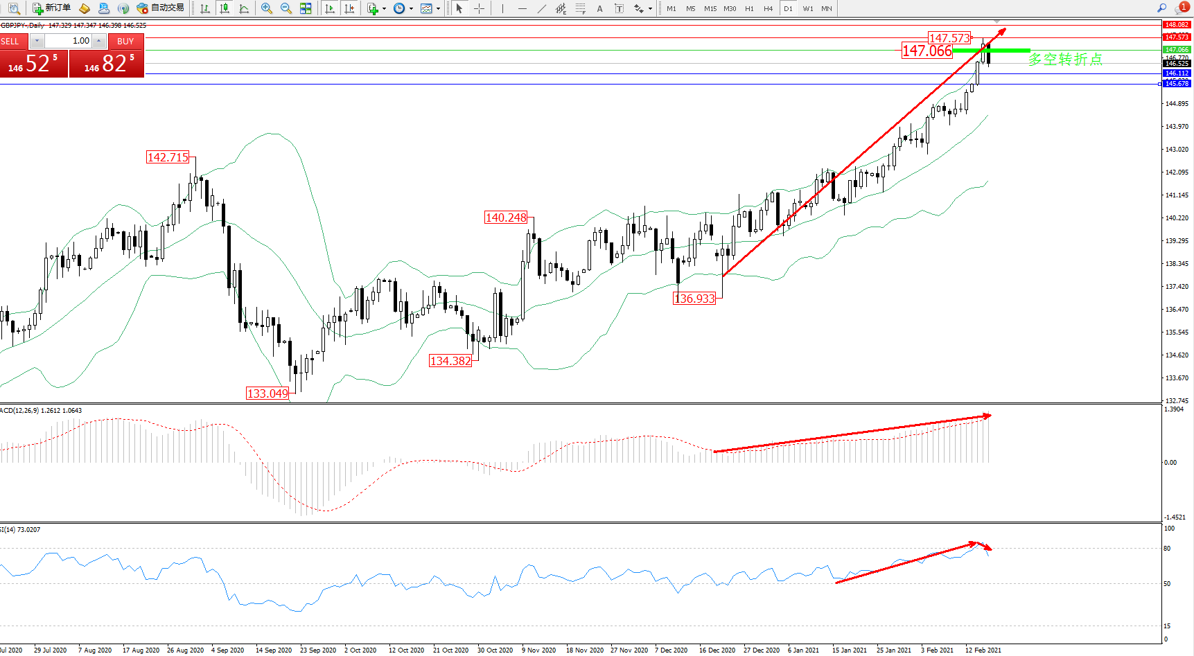 英镑兑日圆处于高位146.525附近整理,2020年第四季度英国经济好于预期,但进入2021年英国重新实施了疫情封锁措施,其经济的近期前景仍然具有挑战性;不过,英国政府已经承诺将逐步放松封锁,英国家庭财政状况继续好转,中长期经济前景更令人鼓舞;英国完成脱欧后双方在经济基本面方面出现了持续加大的落差,在英国已有超过20%的人口完成了至少一剂疫苗注射之后,欧盟的普及率仍不足5%,这也令汇价走势落差进一步凸显;英国中长期经济前景更令人鼓舞,特别是在家庭财务状况仍然相当良好的情况下。在经历了2020年第二季度的下降之后,员工薪酬(季度环比增长3.8%)和家庭可支配收入(季度环比增长4.9%)在第三季度都出现了大幅反弹。