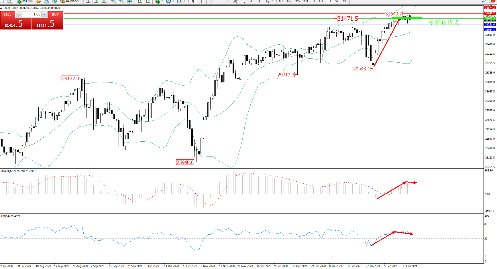技术点评:高位呈V型反转态势强势拉升上扬,高位抵达31649附近节点徘徊中,处于布林带指标中上轨区间持续窄幅震荡,布林带指标呈缓慢张口走势持续中,多头动力维持整理平移态势,MACD指标处于多头区域持续整理上移中,RSI指标处于多头区域维持持续徘徊整理中;