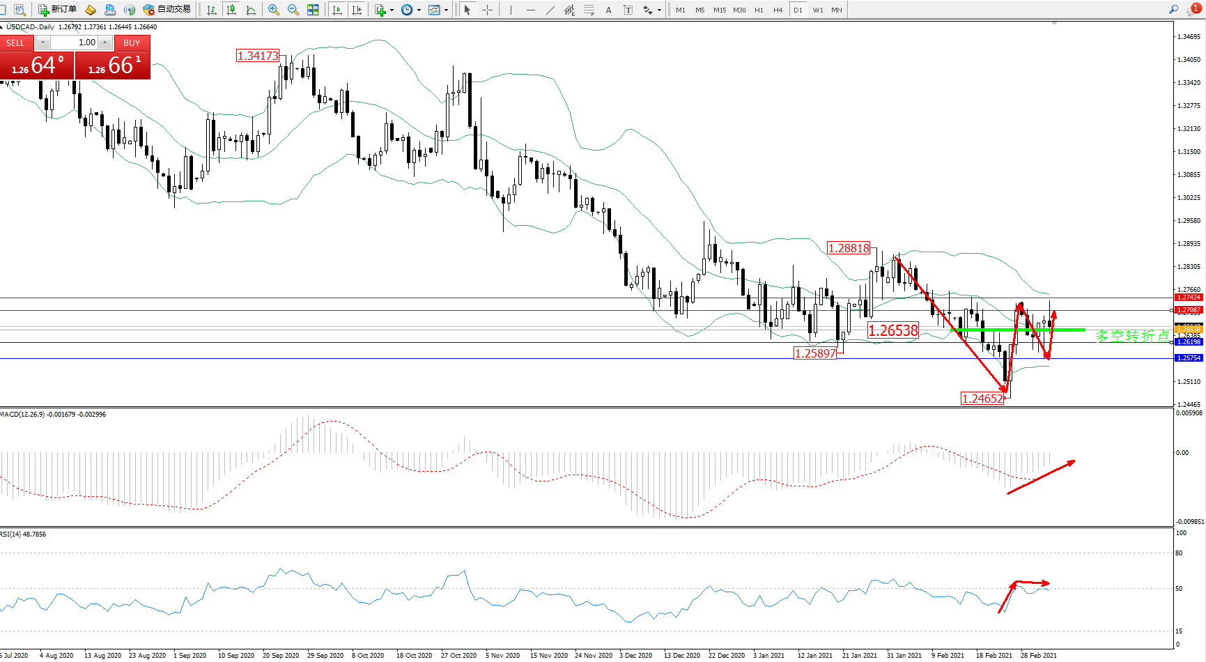 技术点评:空头动力延续布林带指标通道中下轨区间持续震荡下行,低位抵达1.24652位置后得到支撑强势反转上扬,突破布林带指标中轨附近节点后开始维持在中轨附近来回宽幅震荡中,多头动力有继续向上回升态势,布林带指标呈张口走势后开始收口平移,关注中轨附近节点,MACD指标处于空头区域低位维持震荡向上移动中,RSI指标处于50均衡线附近维持窄幅整理平移中;