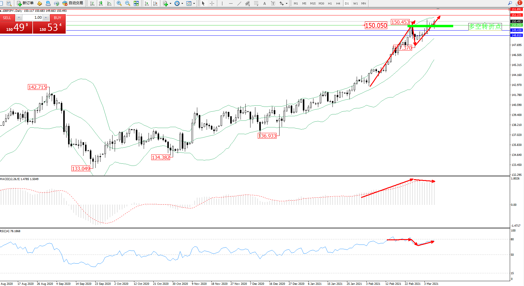 英镑兑日圆高位150.484位置附近维持震荡,美国国债的空头热潮上周创下纪录水平,让交易员有信心瞄准新的目标:日元。从伦敦到东京的策略师都在讨论,随着美国国债收益率的上涨以及全球经济增长态势的改善,尽管英国的新冠死亡人数居欧洲之首,但该国在疫苗方面的表现优于其他国家,已有2100多万人接种了第一剂新冠疫苗。作为英国放松封锁计划的一部分,英格兰的学校周一开学,这是恢复正常的第一步。上周英国财政大臣公布了预算计划,其中包括进一步延长新冠刺激方案以及从2023年开始上调公司税。上周的预算案,支持对于英国经济的未来复苏处于有利形势的看法。