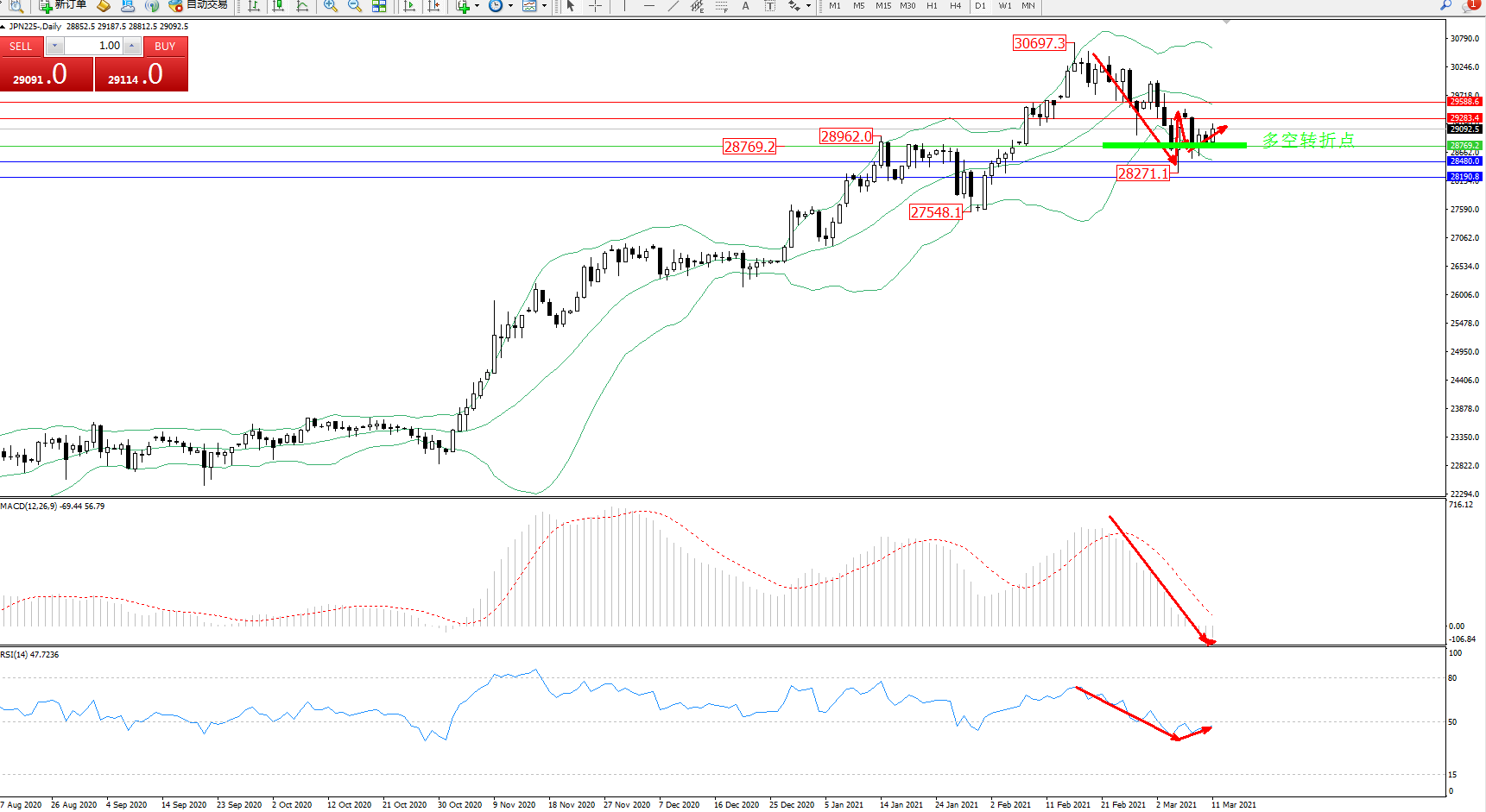 技术点评:高位空头动力维持震荡弱势下行后,低位抵达28271位置节点得到支撑开始短暂维持整理平移中,低位多头动力伺机入场,但尚未出现强势反转态势,布林带指标呈张口走势后缓慢张口,MACD指标空头动力持续震荡下行至0轴线下方空头区域开始徘徊中,RSI指标处于50均衡线下方弱势徘徊中;