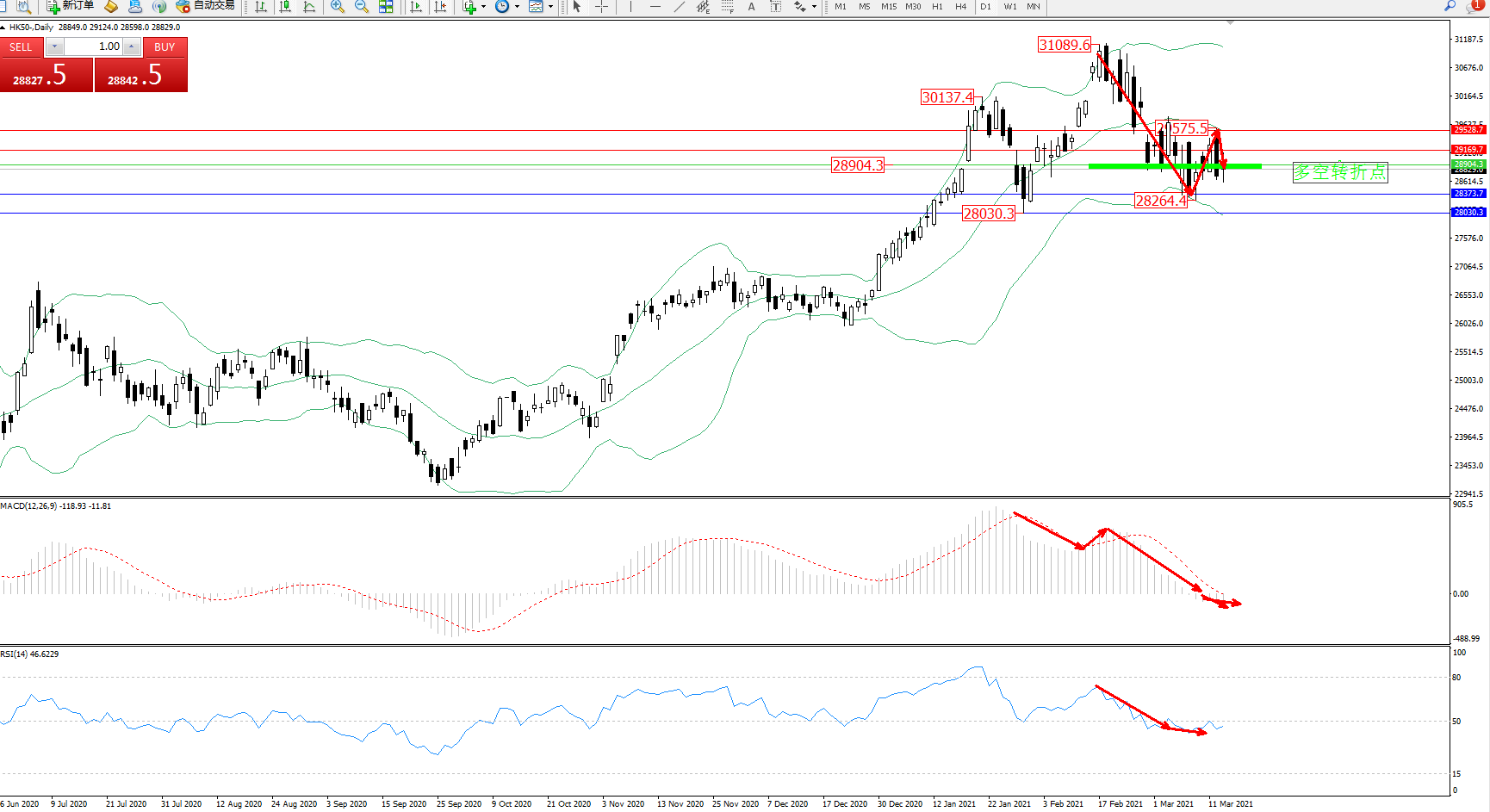 技术点评:高位空头动力持续震荡下行至布林带指标中下轨区间持续宽幅整理,多空动力均处于焦灼状态,短暂触及布林带指标中轨附近节点后遇阻下挫,布林带指标呈张口走势中,空头动力或将进一步向下移动,MACD指标空头动力持续下挫至0轴线下方空头区域弱势徘徊,RSI指标纠结与50均衡线下方窄幅整理中;